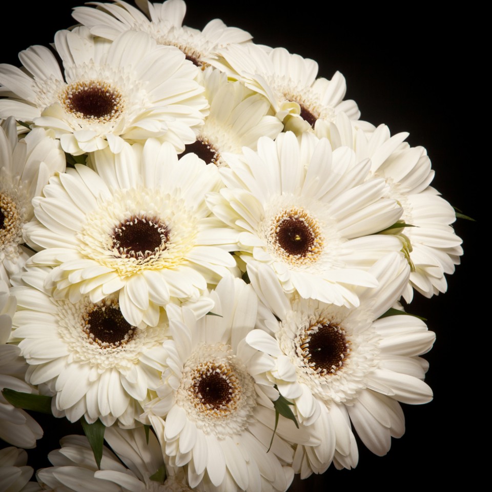 Gerbera White House gehört zu den großblütigen Gerbera und hat eine leuchtenden Farbe in weiss mit einem auffallenden kontrastierenden Herz in der Blüte.