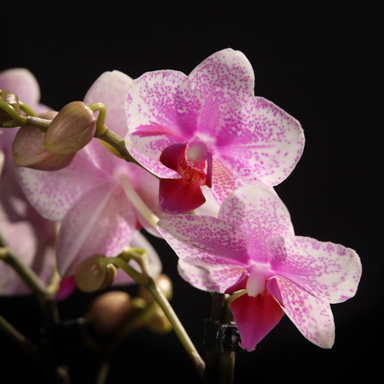Diese Phalaenopsis “Rotterdam”, mit ihren weiß-rosa gepunkteten Blüten, hat eine spielerische Ausstrahlung und gibt ein Farbfeuerwerk ab.